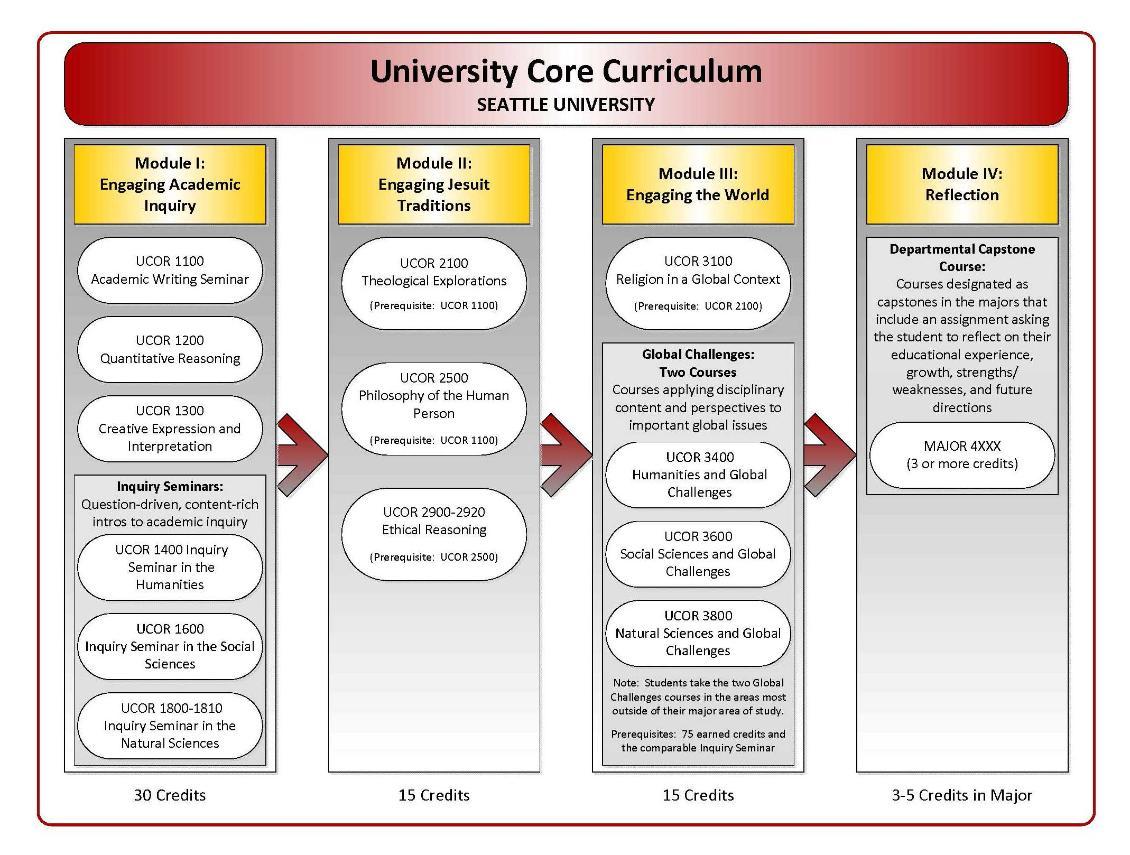 The 60-credit University Core Curriculum consists of a total of 12 courses plus a major-specific capstone course (with a minimum of 3 credits) distributed over four core learning objectives areas.  These courses develop the knowledge, skills, and values identified in the learning objectives across four modules:Visual guide to the University Core curriculum.