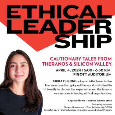 Ethical Leadership: Cautionary Tales from Theranos and Silicon Valley was organized by the Center for Business Ethics with partnering sponsors Student Government of Seattle University (SGSU) and the School of Law's Technology, Innovation Law, and Ethics (TILE) program.