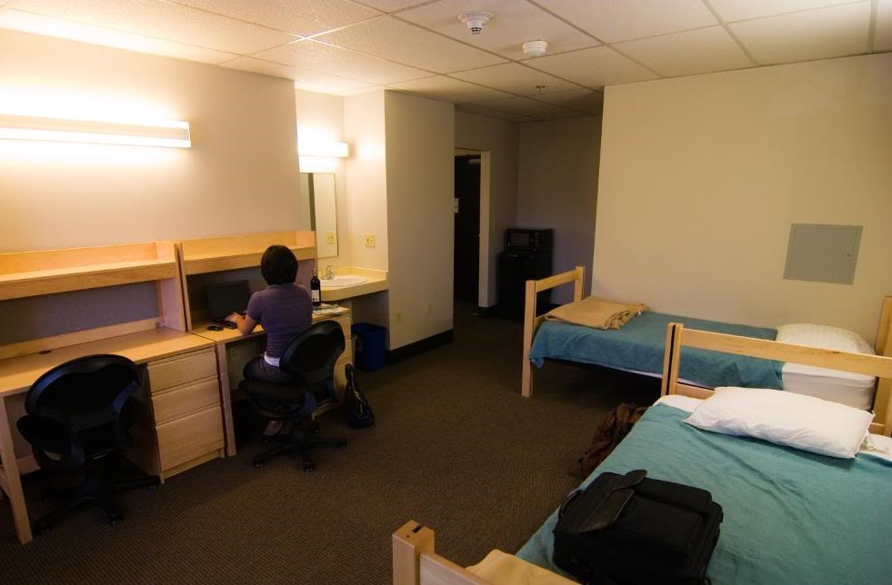 Each room in our residence halls comes with a bed, wardrobe, desk, and chair per person, plus a sink, mirror, and compact microwave/refrigerator unit per room. There is also a large lobby and lounge area, a television room, computer lab, ice machine, kitchen, and laundry facilities in each building.