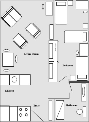 One-bedroom apartments have one bedroom with two or three twin beds. Every apartment contains a kitchenette with full-sized refrigerator, stove, and microwave. Many apartments have dishwashers; disabled-accessible apartments are available.