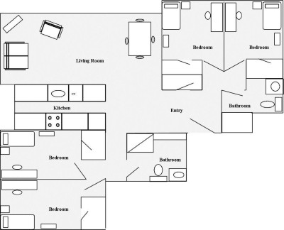 Quad apartments have four single bedrooms, each with one twin bed, and may be arranged for triple or quadruple occupancy (sorry; single and double occupancy options are not available for quad apartments). Each apartment contains a kitchenette with full-sized refrigerator, stove, and microwave. Many apartments have dishwashers; disabled-accessible apartments are available.