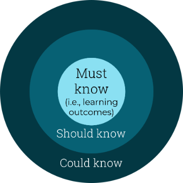 Most of us find we have more items that we would like to include than would be manageable as outcomes. To whittle that list down, it helps to categorize them as topics or skills that students must know to pass the course, should know, or could know, as shown in the graphic. In all likelihood, only items in the “must know” category will become learning outcomes. The other items may be ones that would help differentiate student work at the level of a pass from that at a higher level.