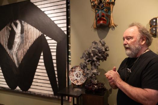 The vastness and eclectic nature of the collection is a celebration of art—the paintings, mixed media and sculptural pieces created by Evans and Mee alongside pieces they’ve amassed over the years, including a noteworthy collection of Indigenous masks from around the world. These pieces both complement and fit well into the university’s existing permanent collection.