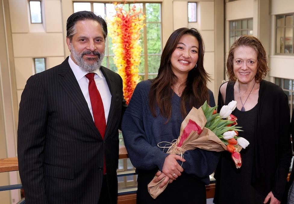Naho Umitani with President Eduardo Peñalver and Economics Chair and Professor Bridget Hidemann.