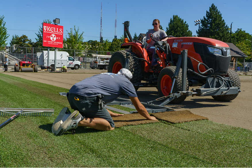 To replace the turf, contractor Premier Field Development removed the grass and about 8-9 inches of soil, installed conduit under the field, then replaced the soil and finally the new turf, which was installed in mid-July.