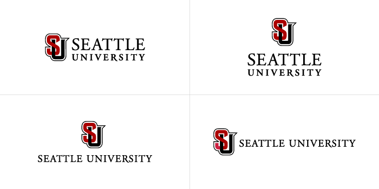 The SU interlock, when used alone, is used for athletics and social media activities but can be paired alongside the Seattle University wordmark, as shown below. The interlock lockups include a left-justified and center-justified mark with the wordmark stacked and unstacked.