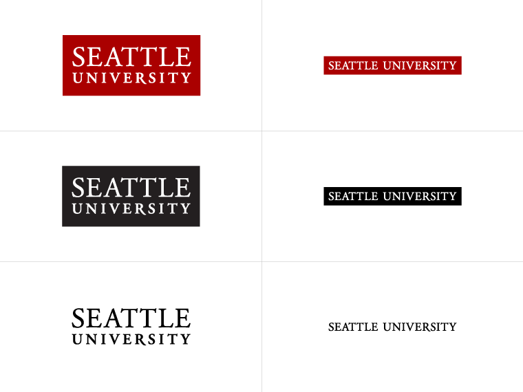 The Seattle University wordmark serves as our institution’s primary visual identifier. Stacked and non-stacked versions showcase a classic serif typeface against a white, black or red background.