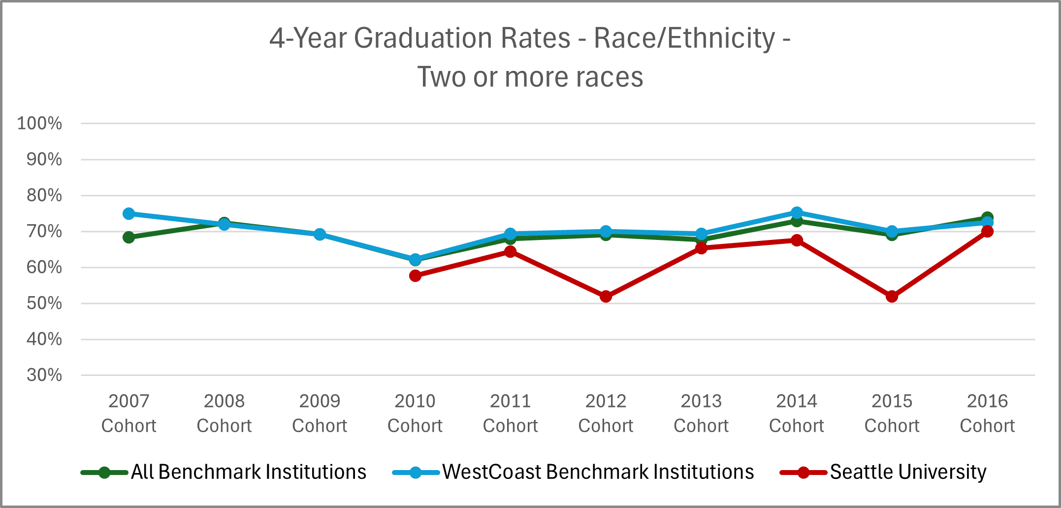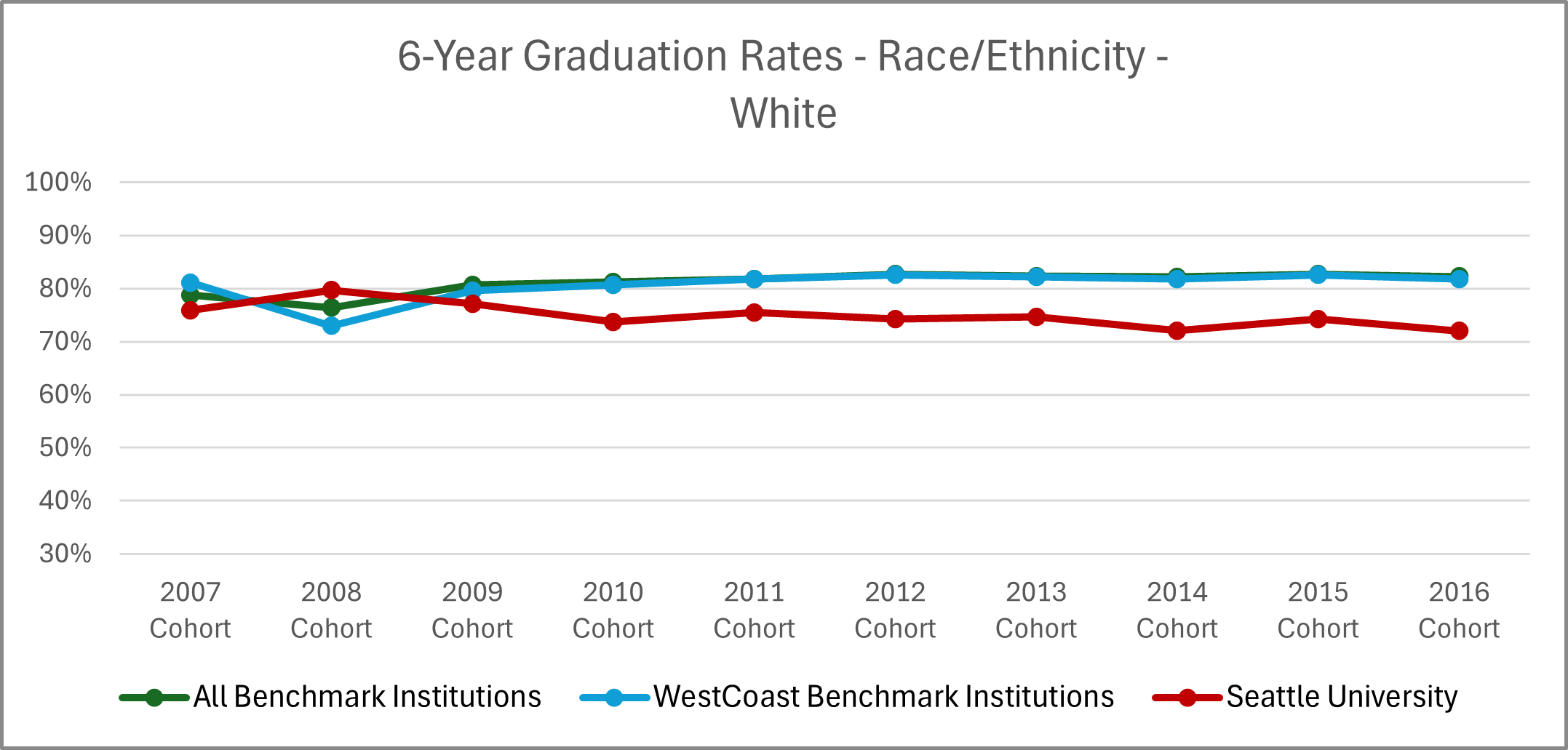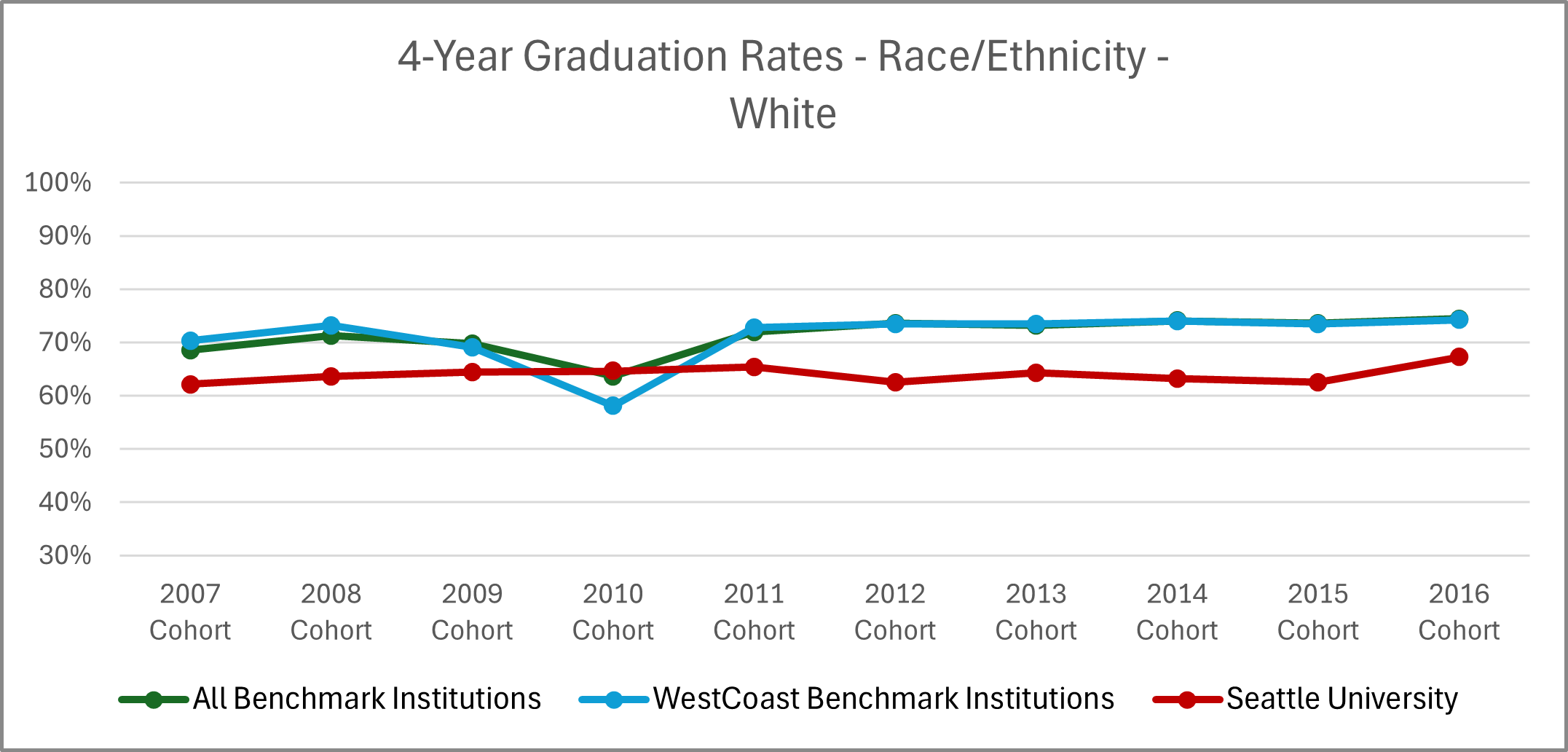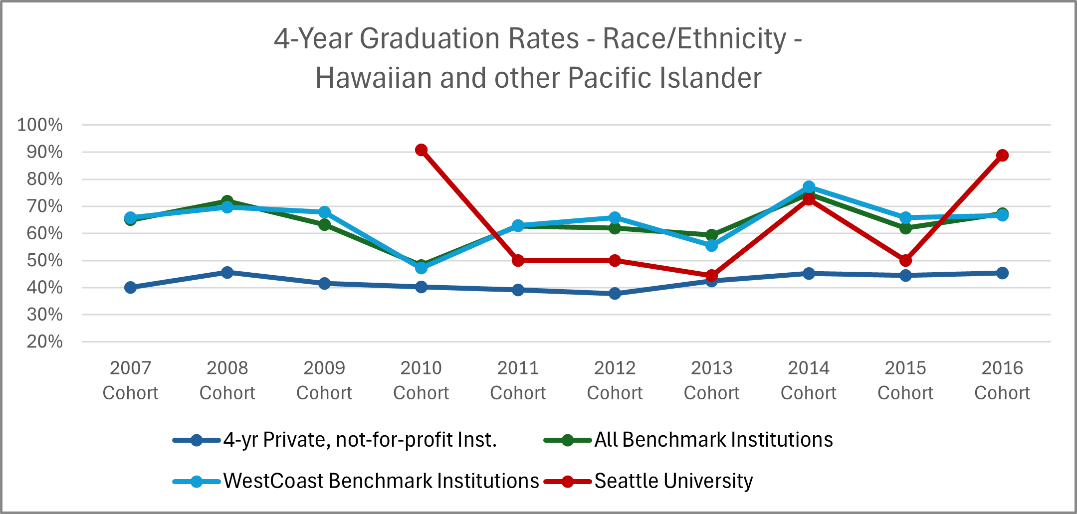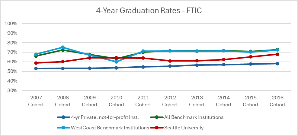 | Cohort Year | 4-yr Private, not-for-profit Institutions | All Benchmark Institutions | WestCoast Benchmark Institutions | Seattle University |