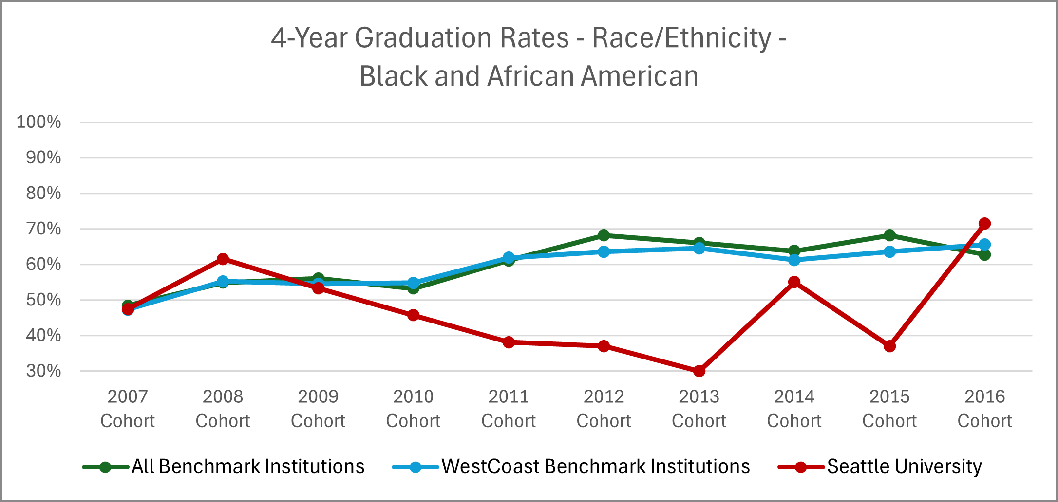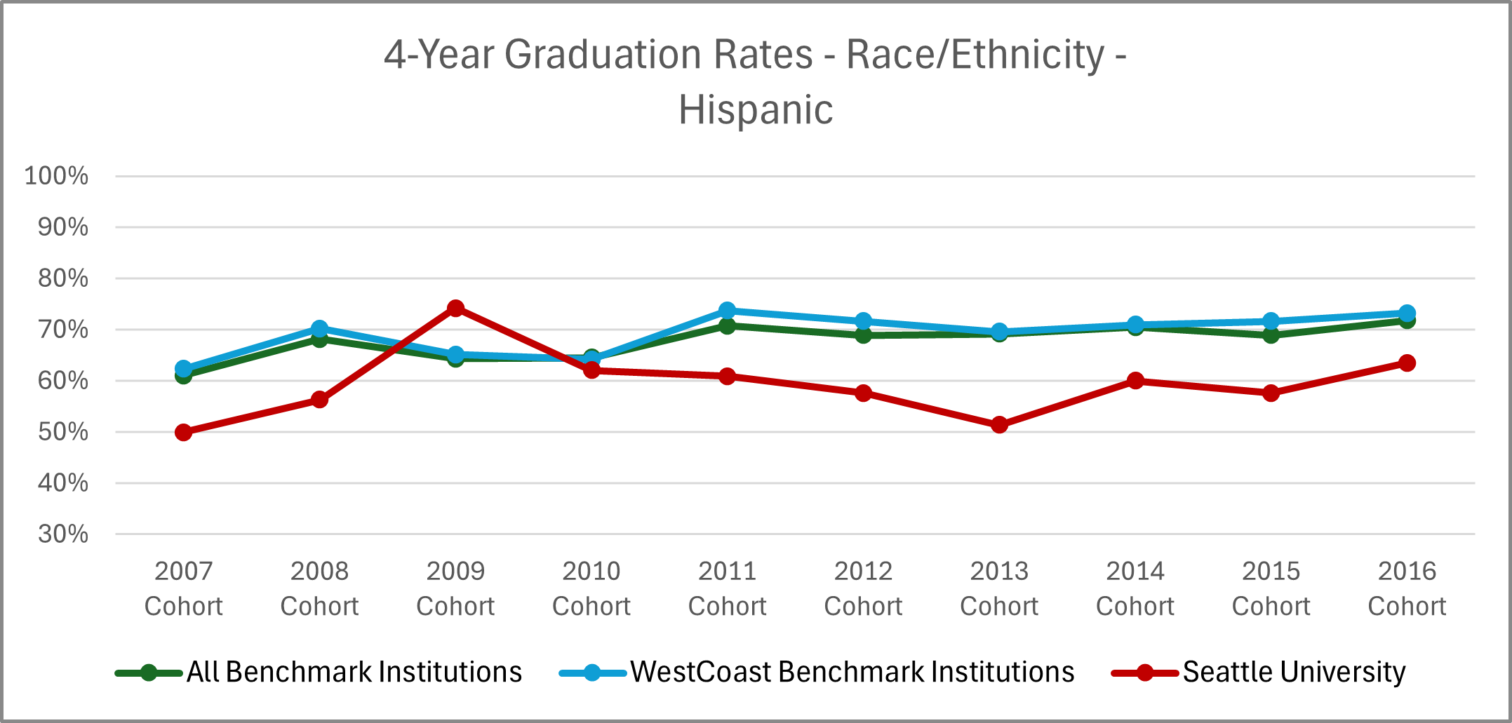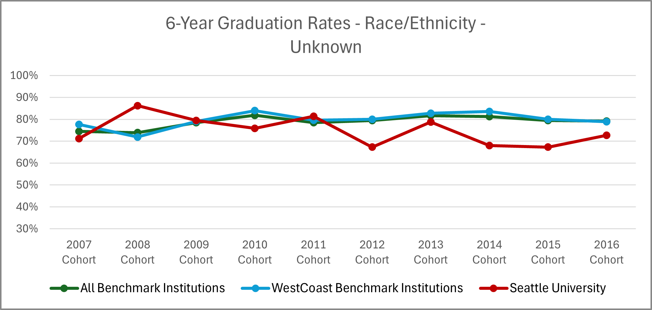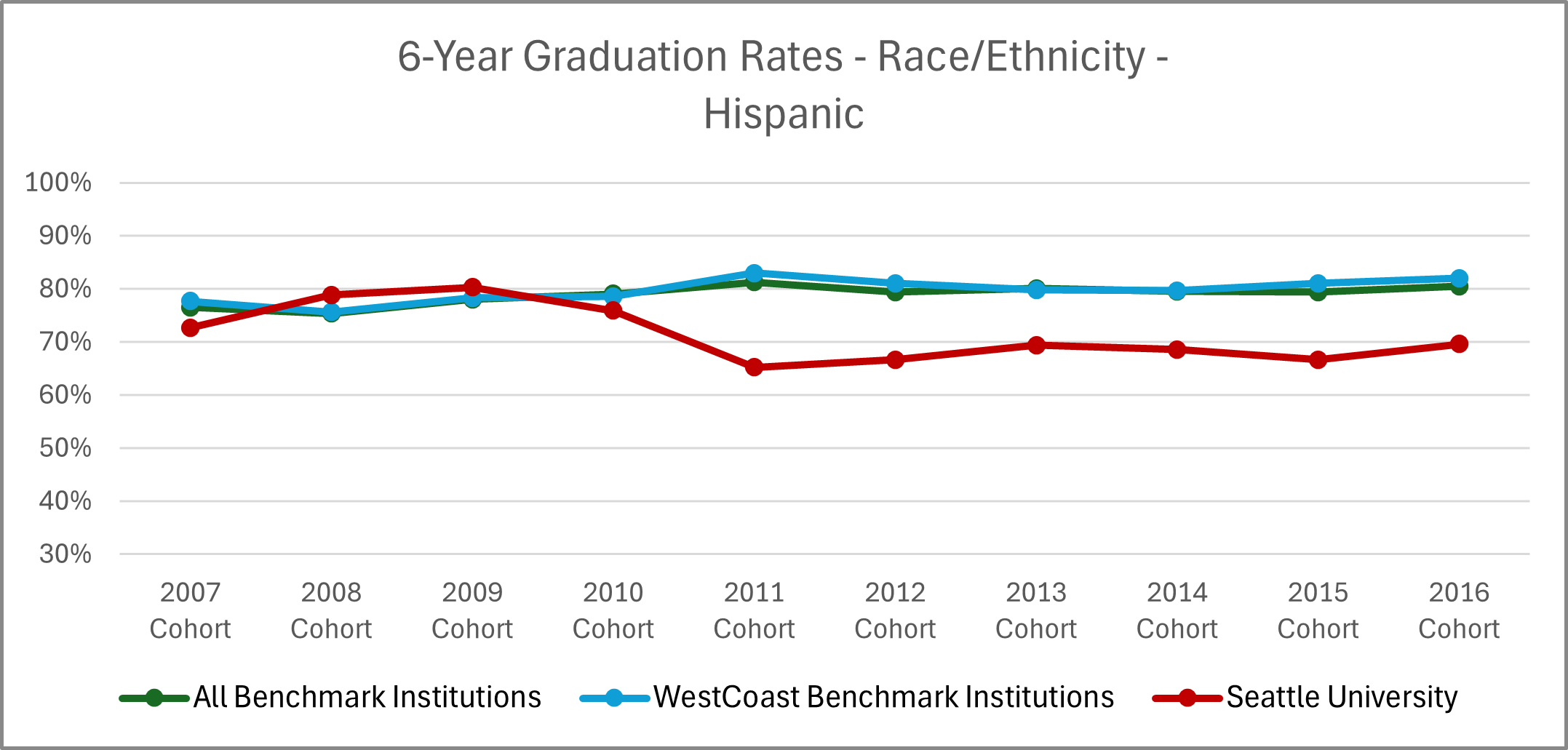 | Cohort Year | 4-yr Private, not-for-profit Institutions | All Benchmark Institutions | WestCoast Benchmark Institutions | Seattle University |