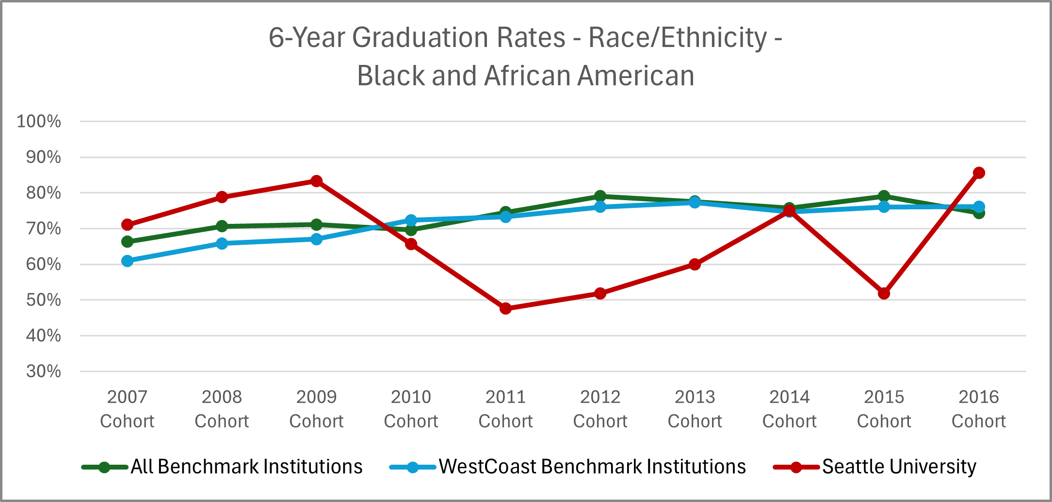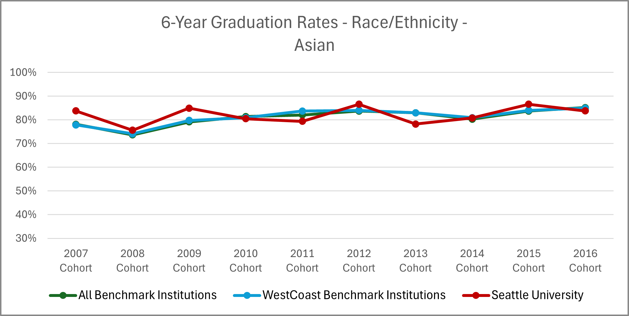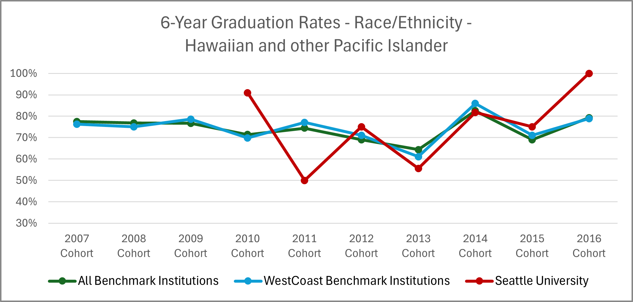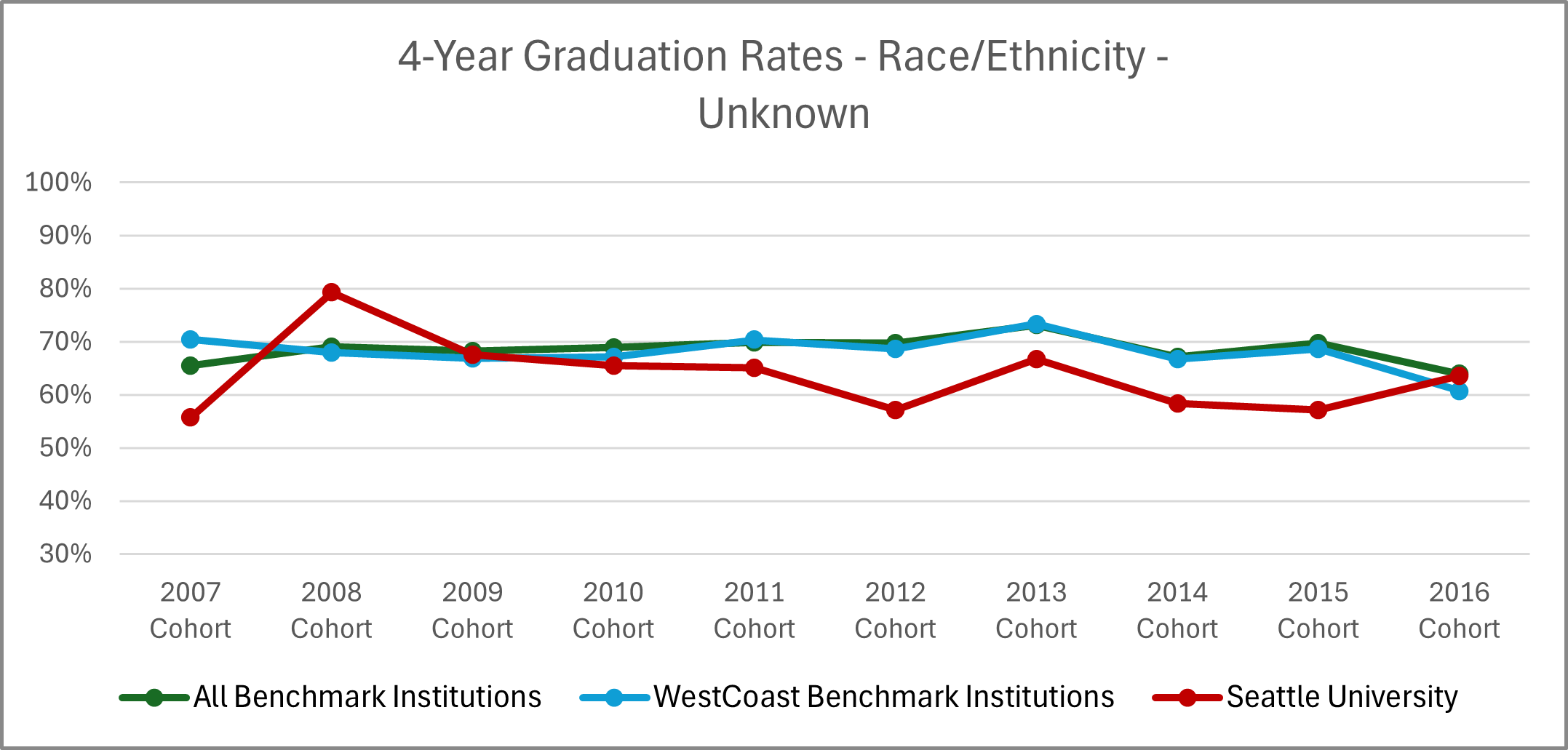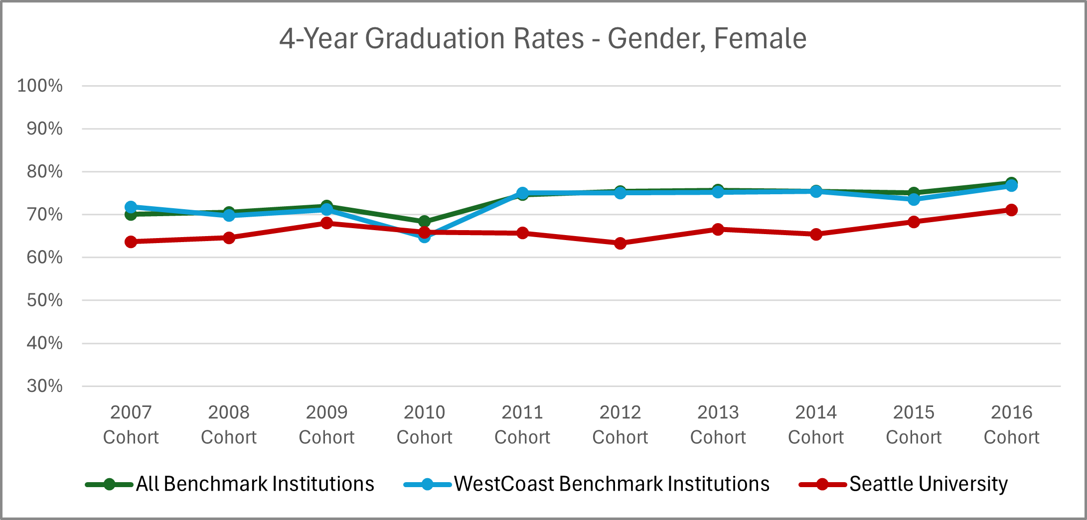 | Cohort Year | 4-yr Private, not-for-profit Institutions | All Benchmark Institutions | WestCoast Benchmark Institutions | Seattle University |