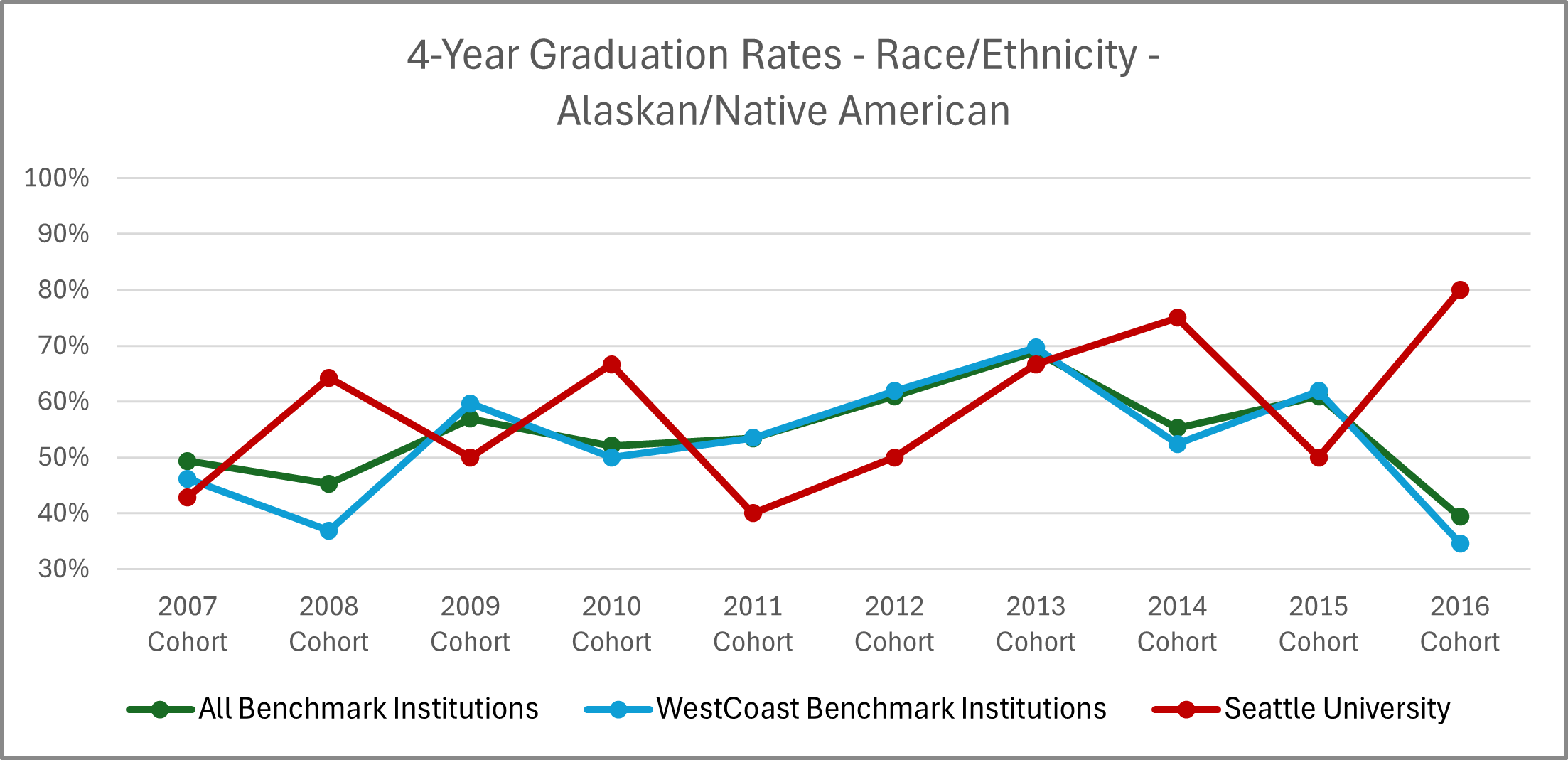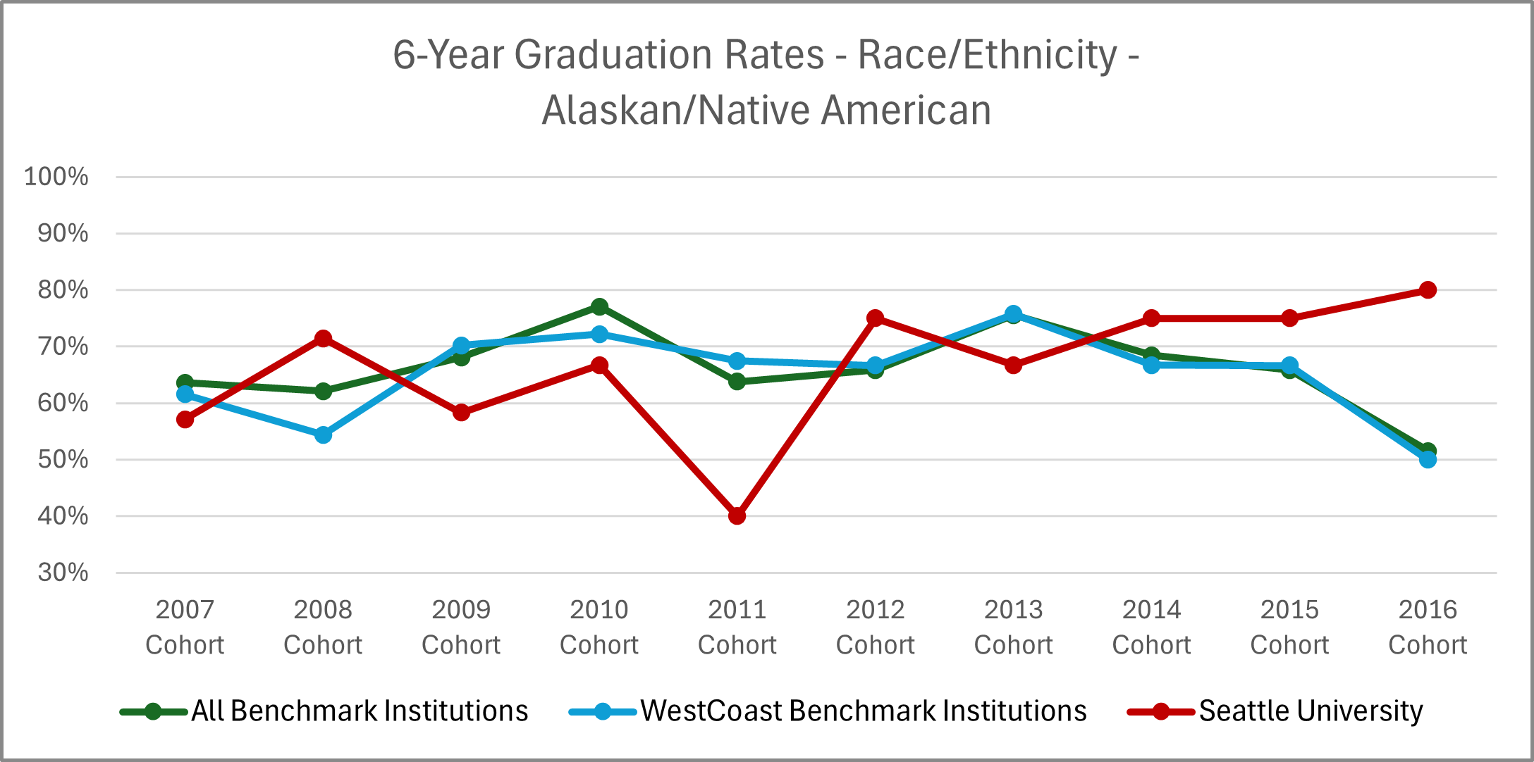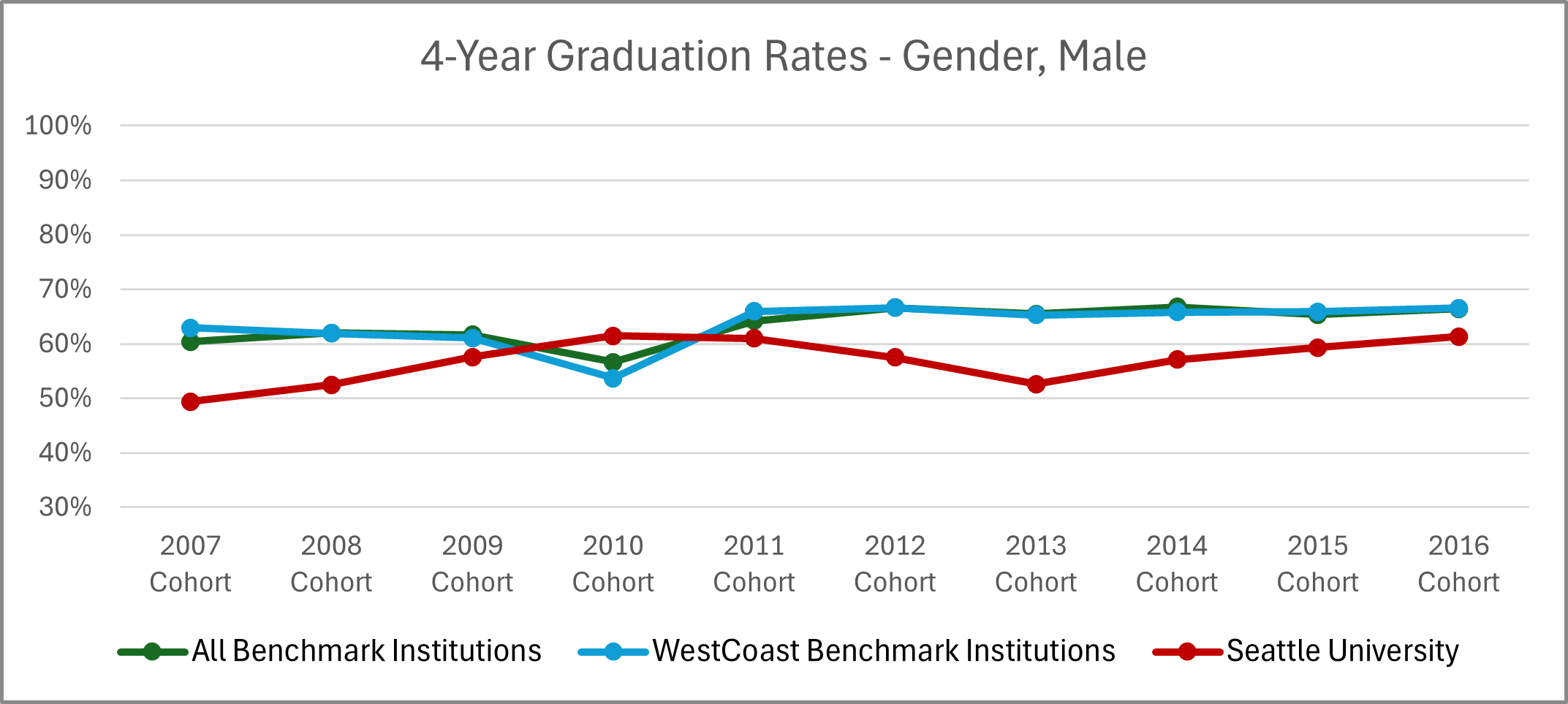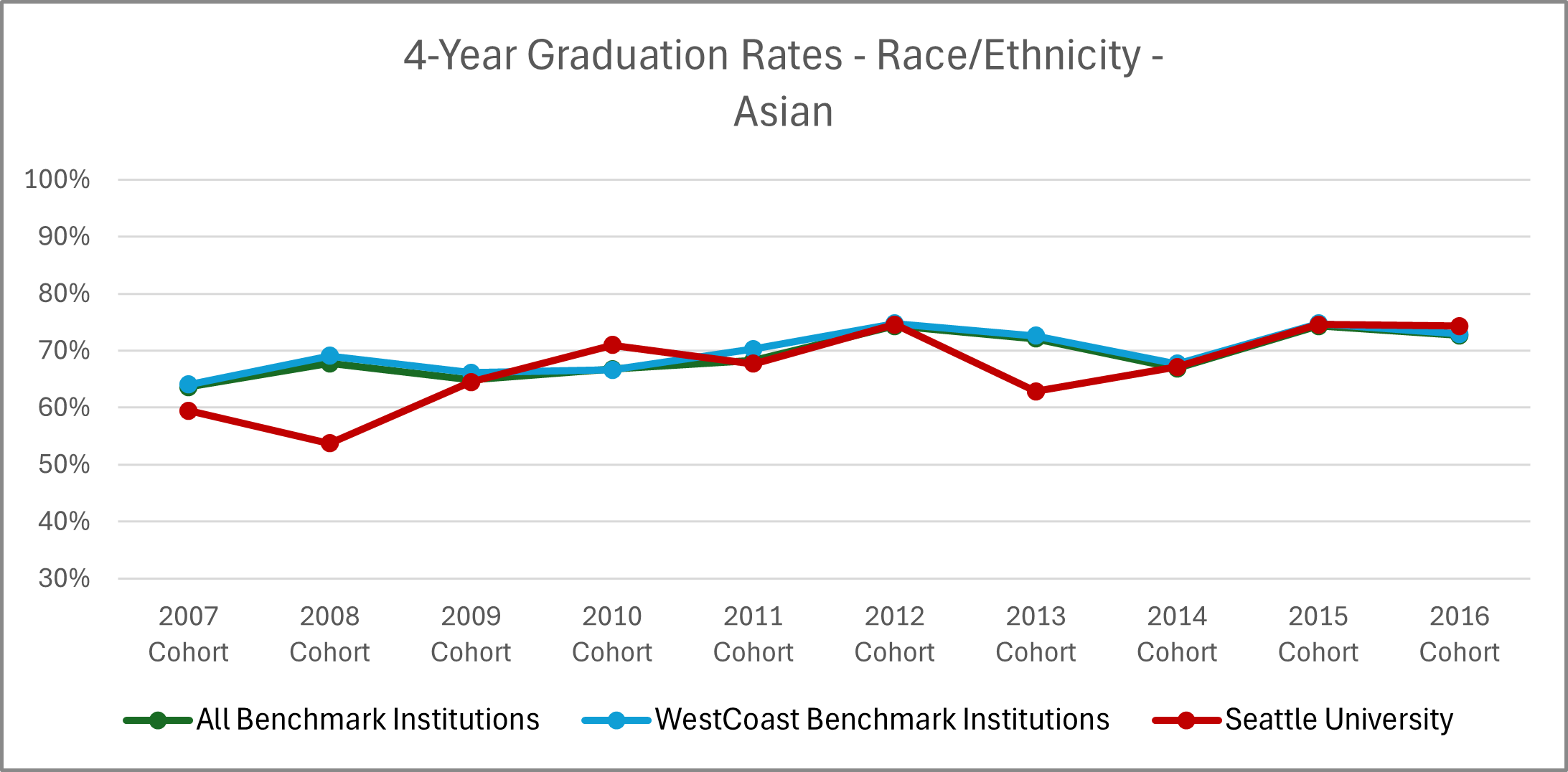 | Cohort Year | 4-yr Private, not-for-profit Institutions | All Benchmark Institutions | WestCoast Benchmark Institutions | Seattle University |