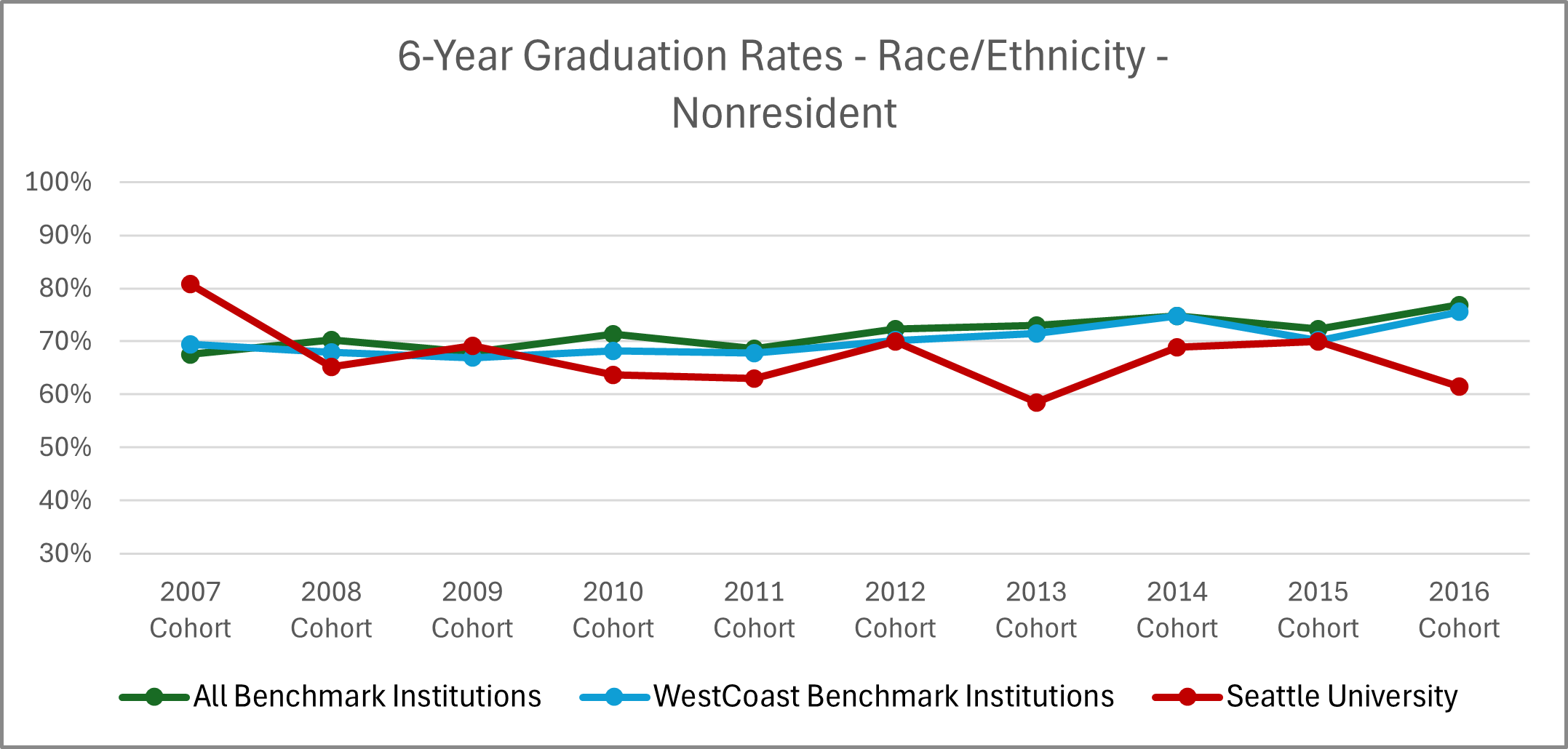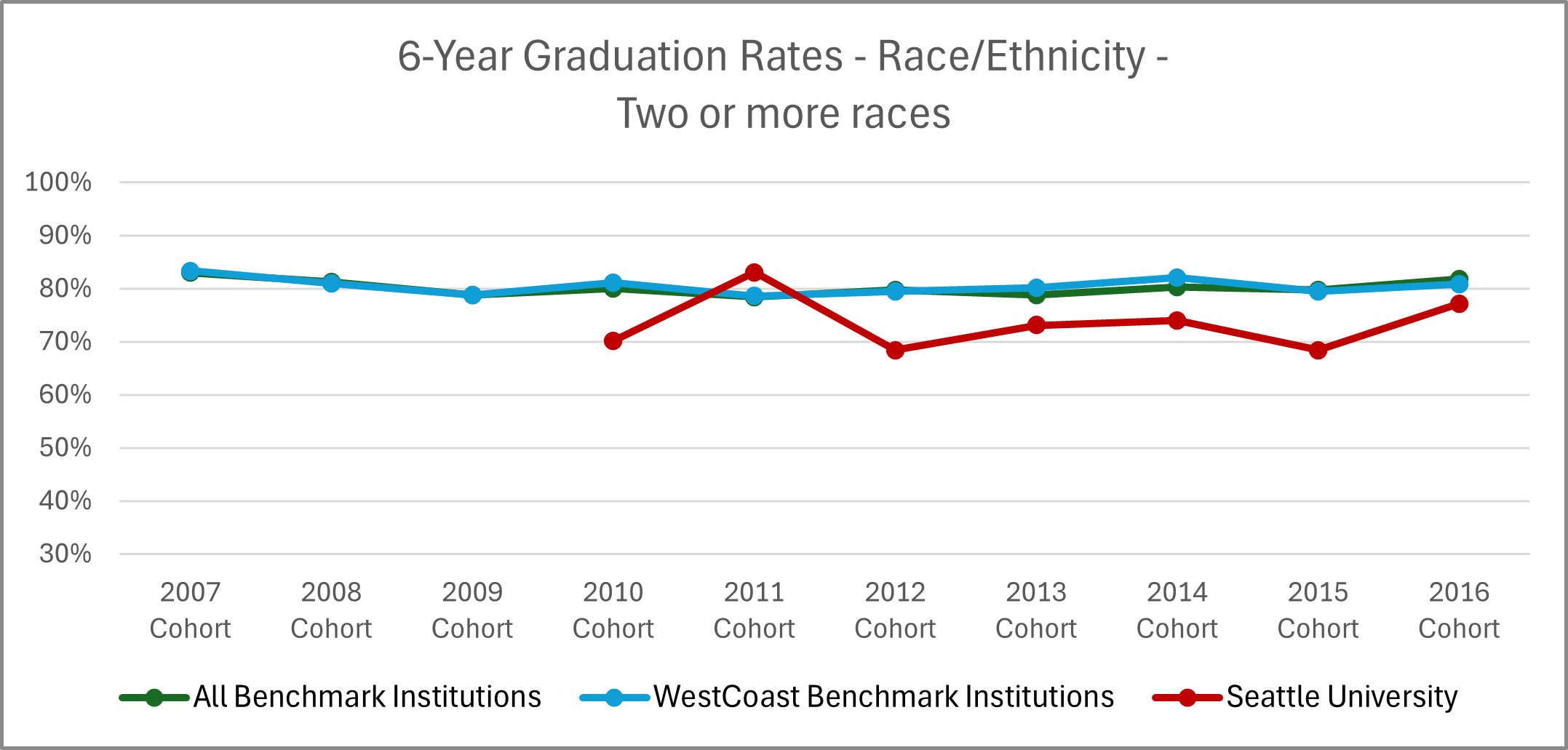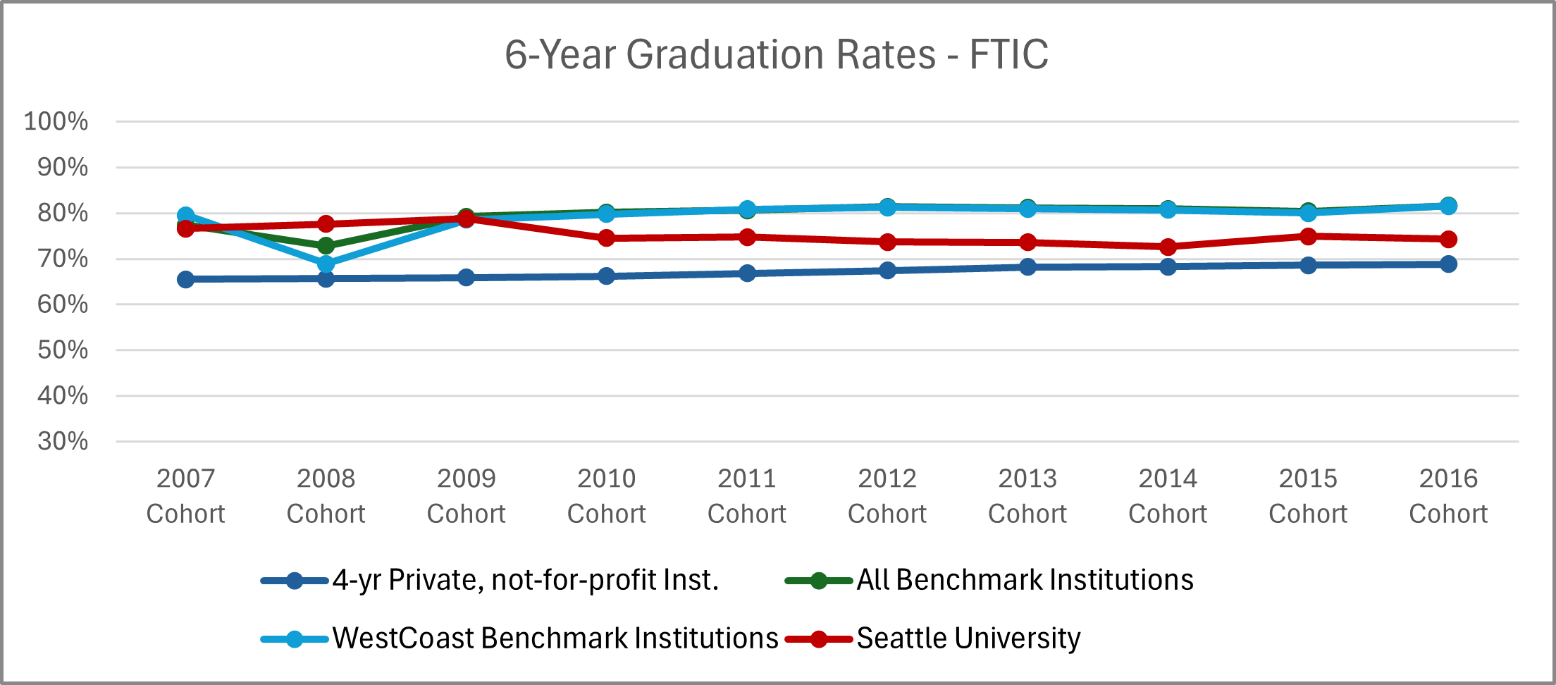 | Cohort Year | 4-yr Private, not-for-profit Inst. | All Benchmark Institutions | WestCoast Benchmark Institutions | Seattle University |