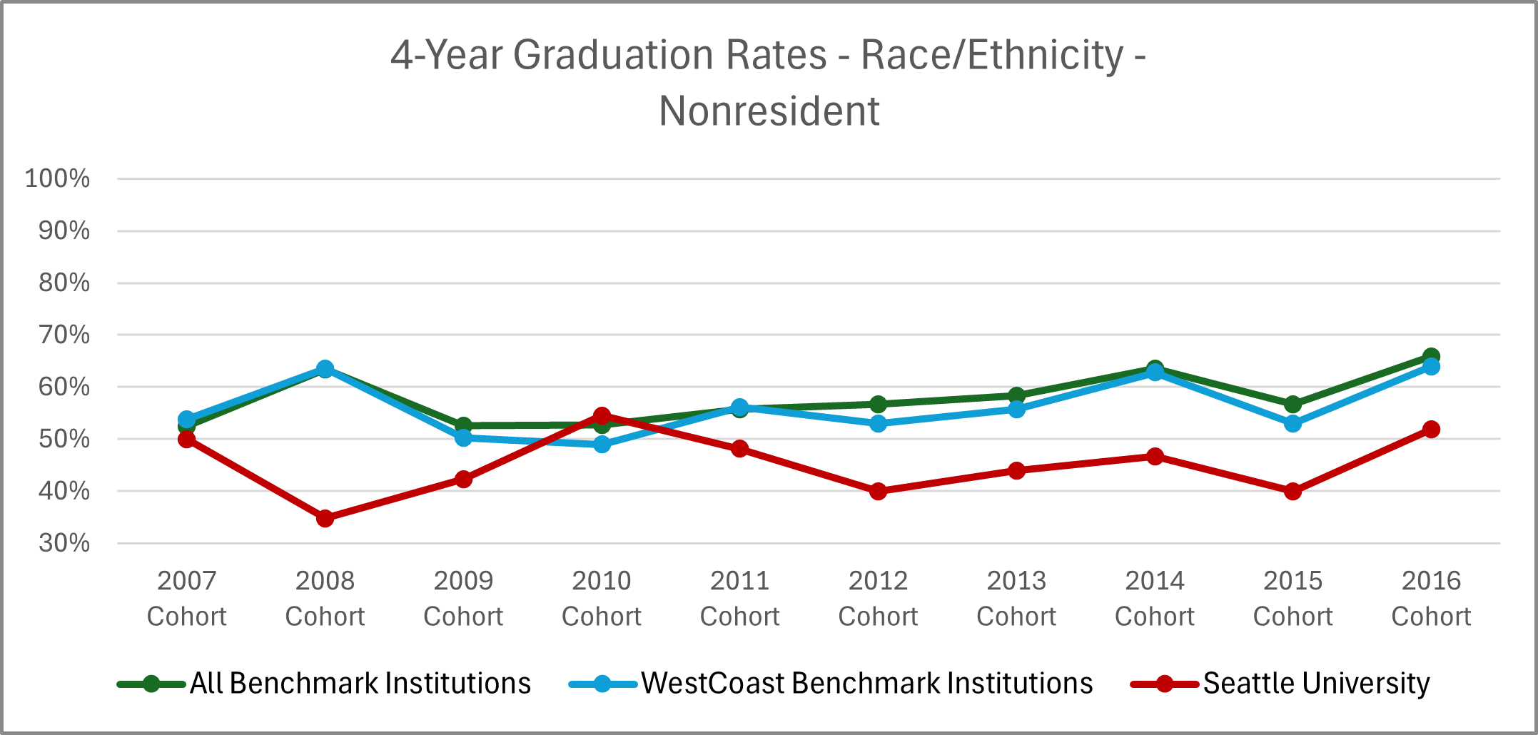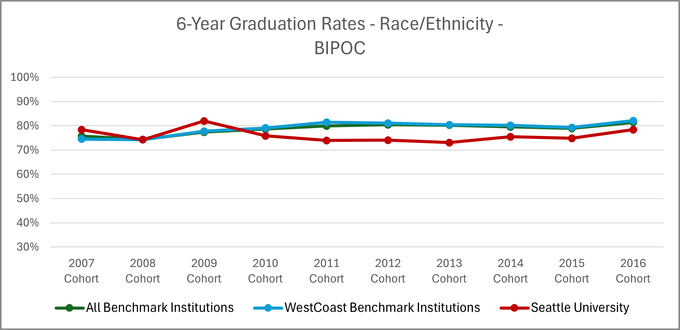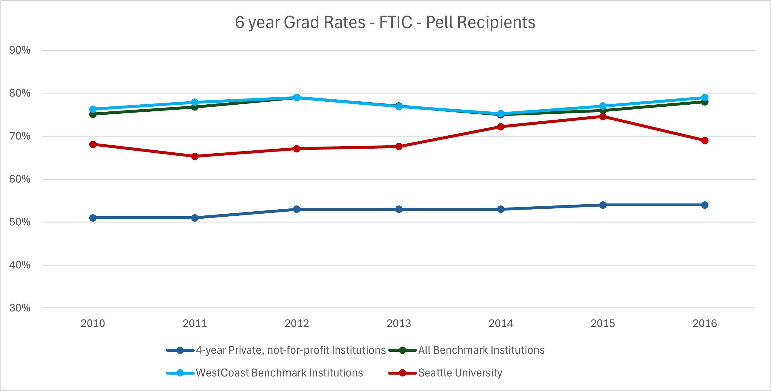 | Cohort Year | 4-yr Private, not-for-profit Inst. | All Benchmark Institutions | WestCoast Benchmark Institutions | Seattle University |