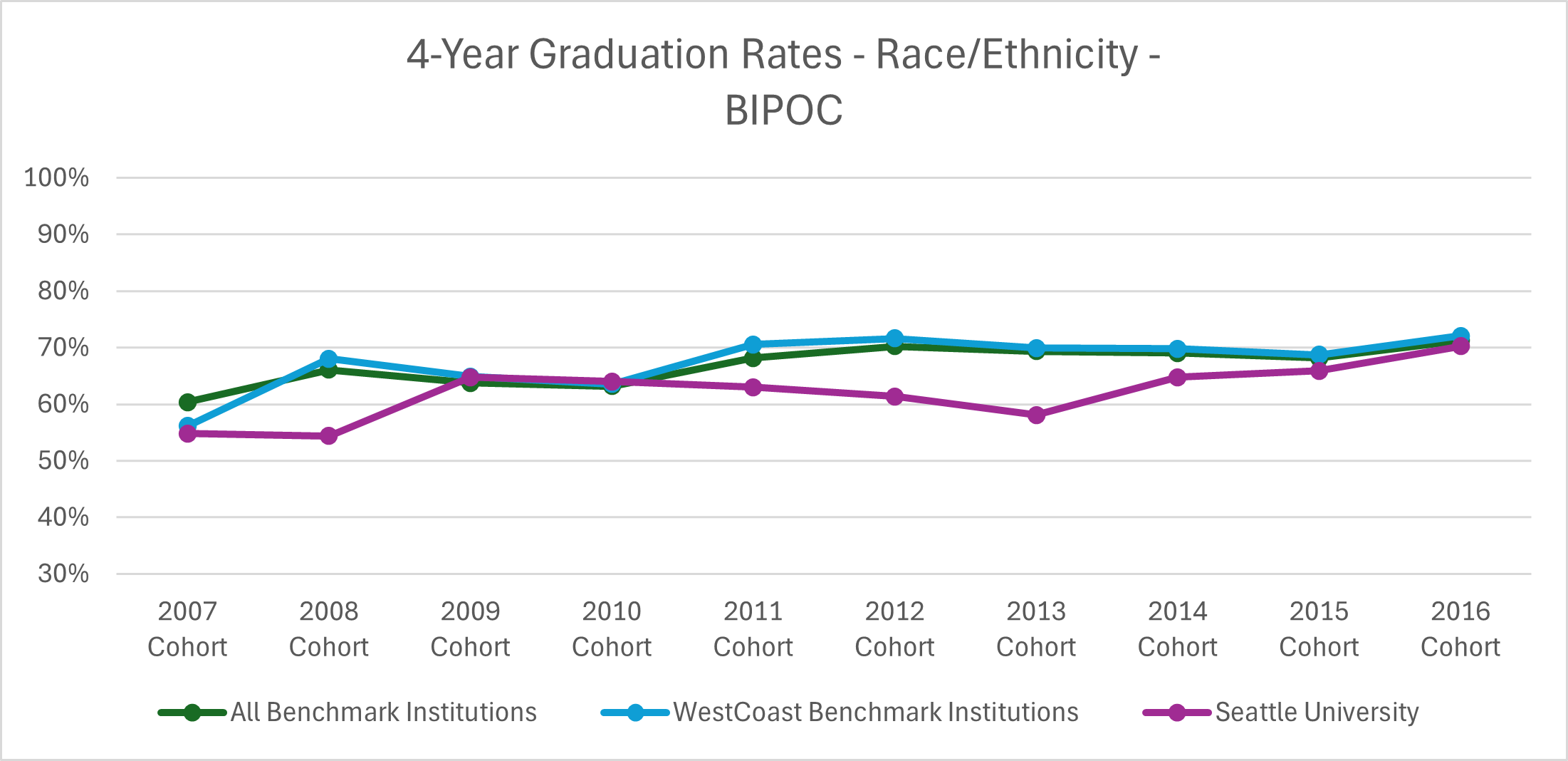 | Cohort Year | 4-yr Private, not-for-profit Institutions | All Benchmark Institutions | WestCoast Benchmark Institutions | Seattle University |