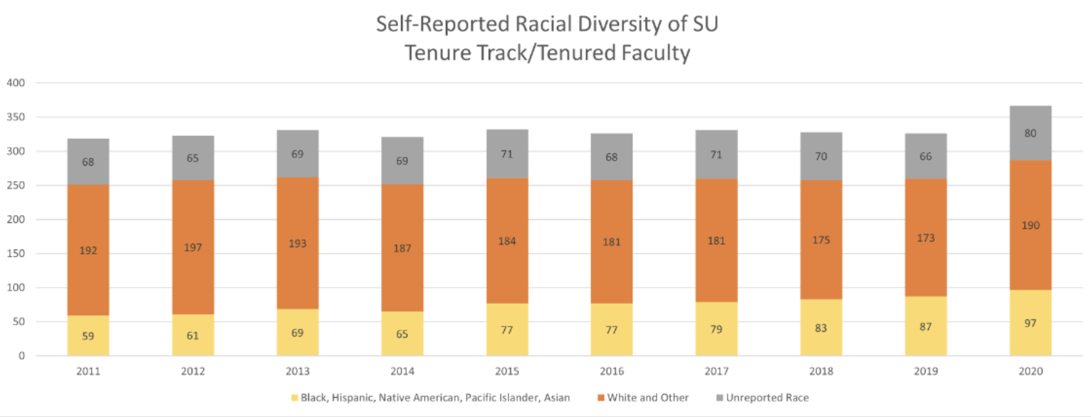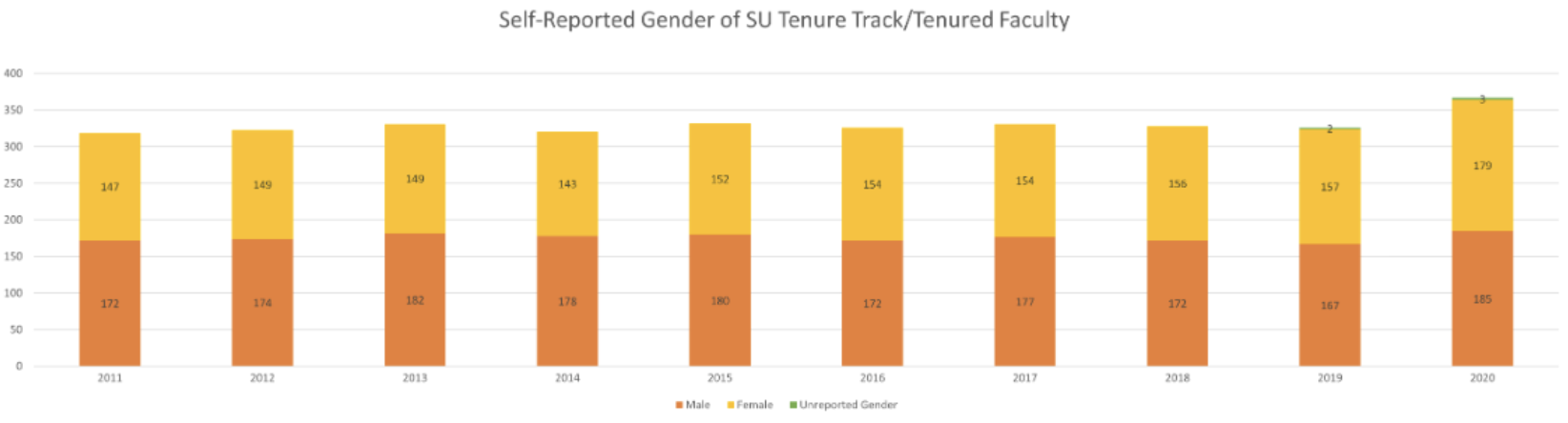 We offer a brief overview of some of the faculty data SU ADVANCE had collected and analyzed as of 2020. Most of this work was done by SU ADVANCE team member, Dr. Donna Sylvester.