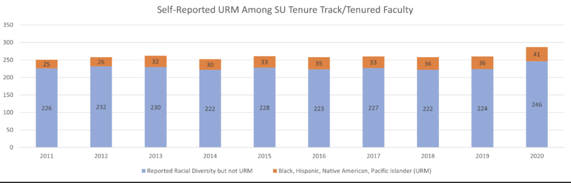 First, we show a breakdown of the gendered and racial composition of tenured or tenure-track SU faculty across the institution. A few issues complicate these data snapshots. First, it only became possible for SU faculty to list gender as an "unreported category" in 2019, as prior to that, faculty had to pick either "male" or "female." Second, this analysis was complicated by the fact that race is not known for a large percentage of our faculty. This is thought to be a result of both gaps in the method of collecting this data point and also with the categories themselves (which are based on the admittedly problematic US census categories). “Under-Represented Minority” or URM as it is used here is a meta-category that includes Black, Hispanic, Native American, and Pacific Islander categories. “All Diversity” as a meta-category includes faculty who identify as URM or as Asian and excludes faculty who identify as White or Unknown.