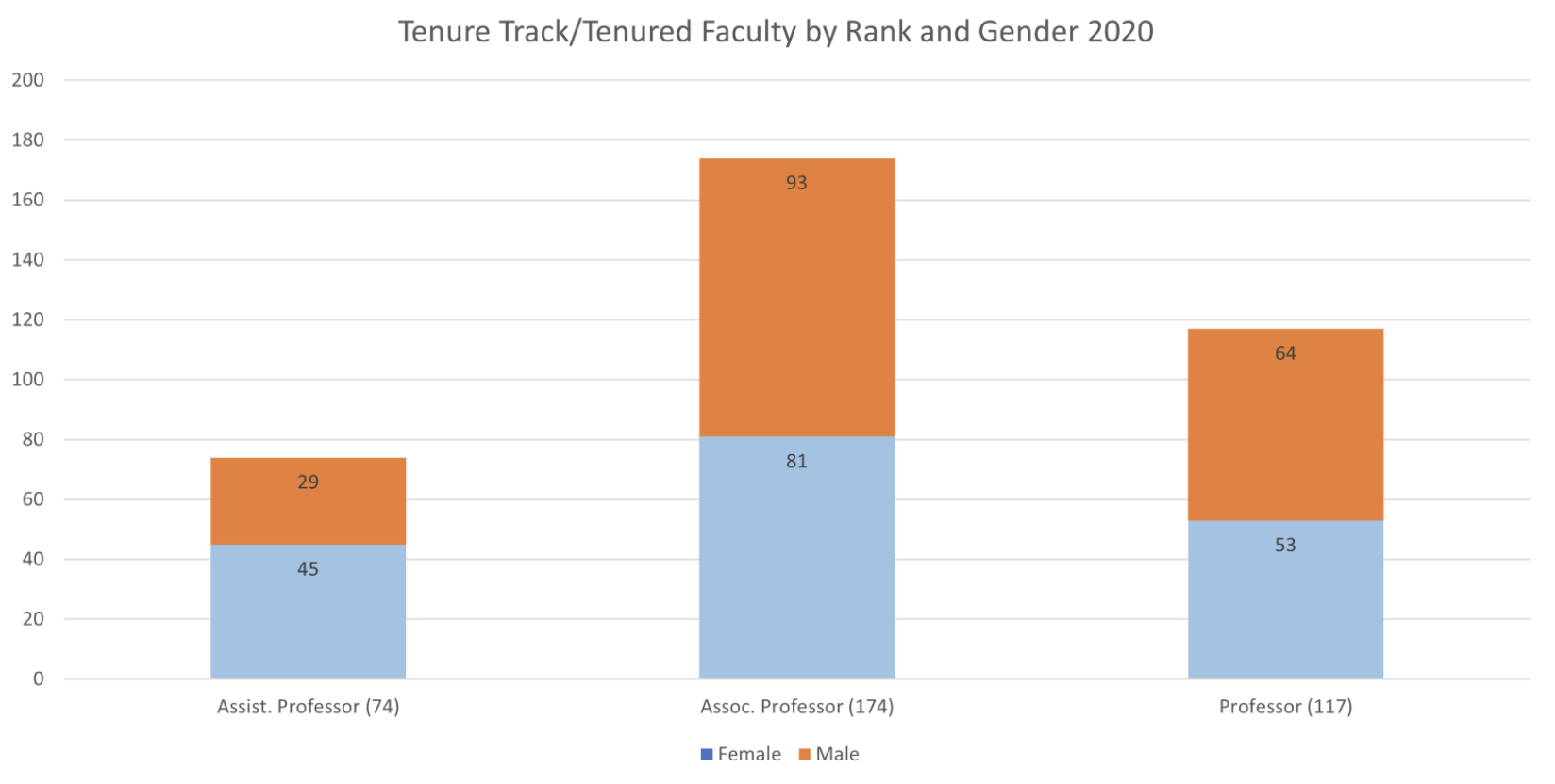 Because of the focus of SU ADVANCE on the effects that gender and certain types of administrative service have on patterns of promotion, we also include the following comparison of tenured and tenure track faculty by rank and gender as of 2020.